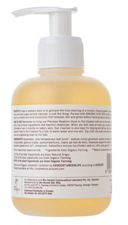 Remember to bring our Precious Newborn Head to Toe Cleanser with you to the hospital so that your baby‘s first bath is free of harsh ingredients and harmful chemicals. When you bath baby at home, you can either add our cleanser to the bath water or use it directly on baby’s skin. Our cleanser is also ideal for topping and tailing. Add a pumpful of Precious Newborn Head to Toe Cleanser to a tub of warm water and mix well. Dip cloth into water and wipe baby down, starting with his head and progressing down to his feet.