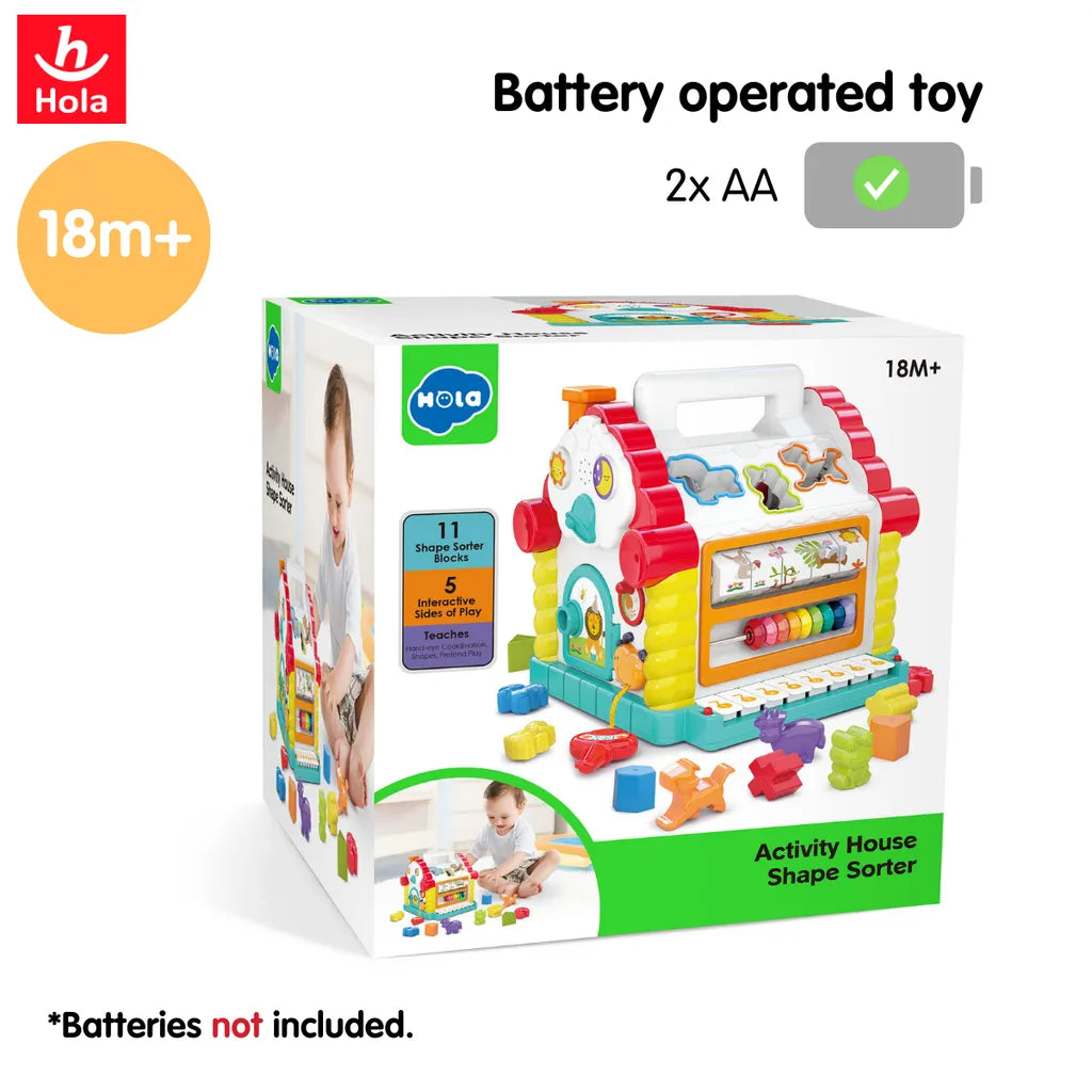 This toy house and shape sorter comes with various functions to increase your child’s learning ability and sensory interactions. Your child can learn the different sounds of animals, geometrical shapes, colors, and counting. The variety of games can help stimulate your child’s imagination, while the sounds, music, and flashing lights bring fun and excitement to their learning.