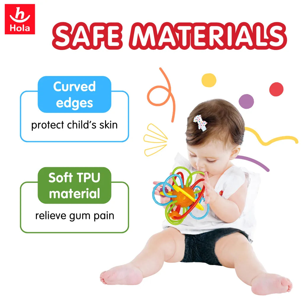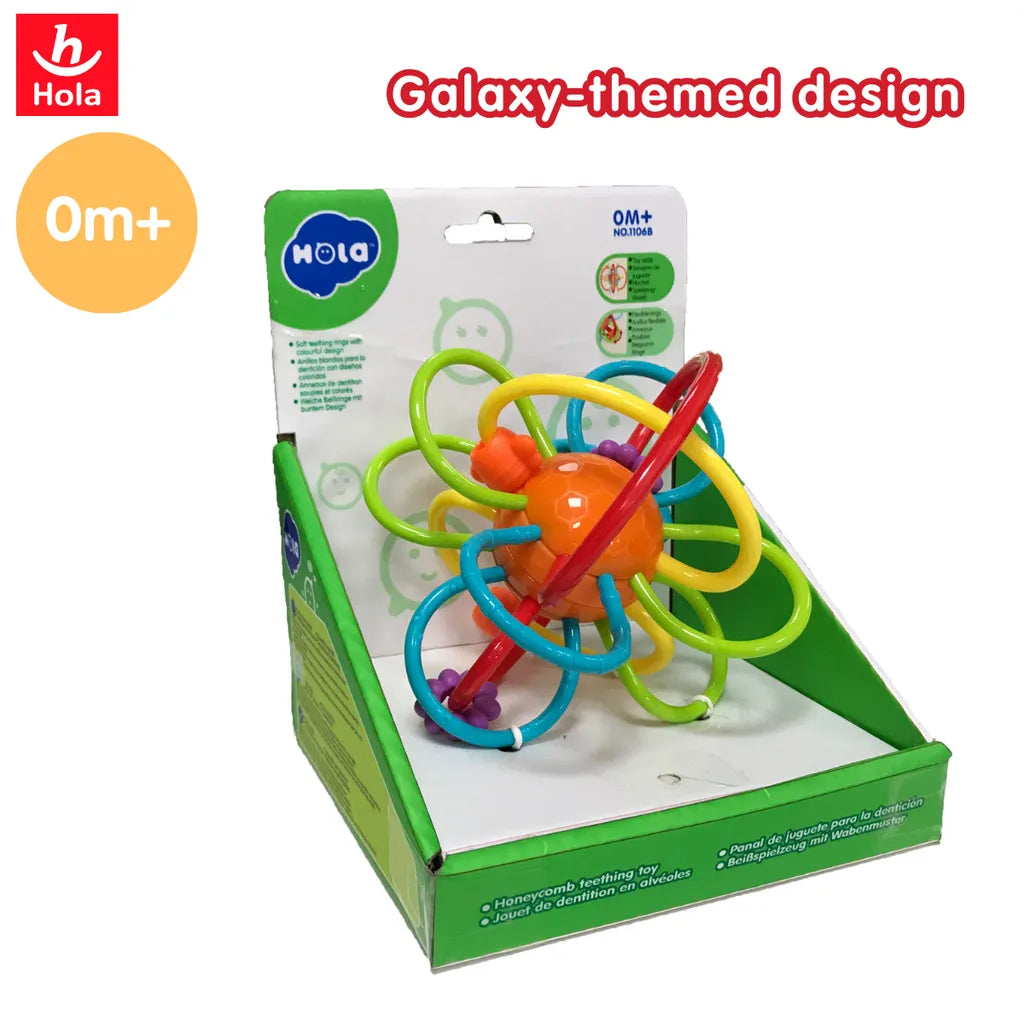 This lightweight, brightly colored toy is a combination rattle and teether, with moving parts that help infants develop sensory and fine motor skills. The flexible rings stretch when pulled, and the center ball can spin and make sounds to stimulate your child. Its galaxy-themed design with curved edges ensures that your child's skin is protected, and its soft TPU material helps to massage gums and relieve gum pain caused by teething.