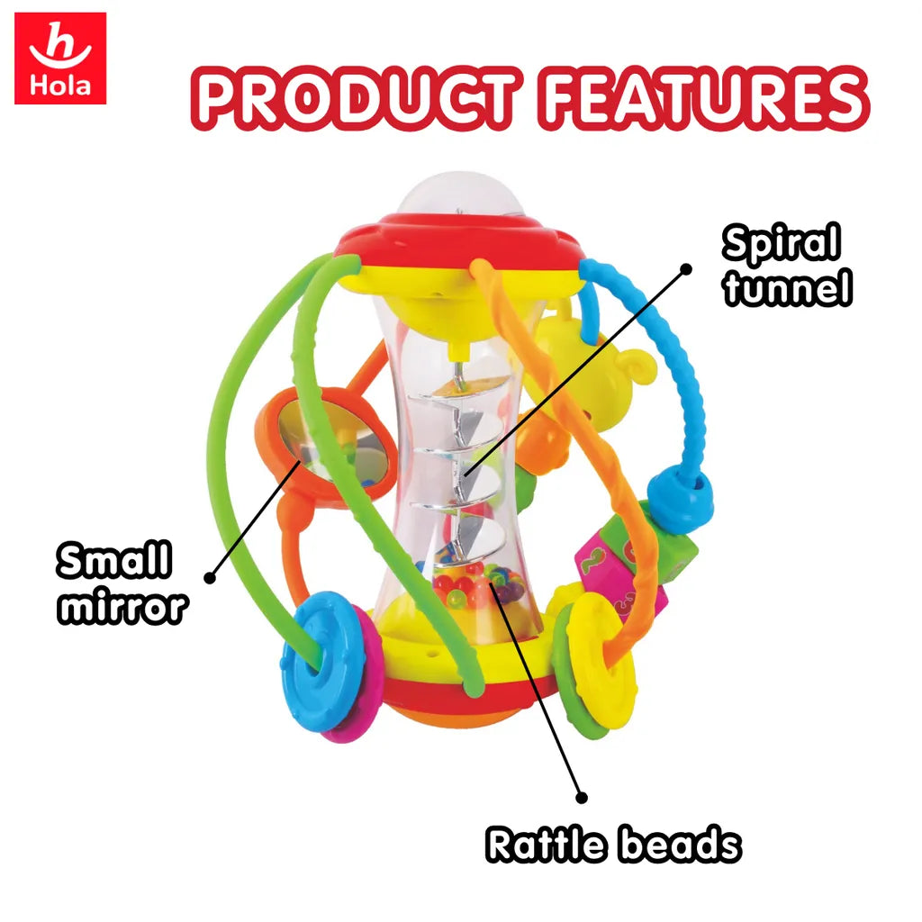 This colorful and cute toy consists of various features designed to help your child develop various basic skills. Gripping and shaking the toy can help improve your child's fine motor skills. The beads and mirror can help improve their observation ability. The various bright colors can help stimulate their visual development. The sounds from small beads on the ball can stimulate their hearing development. The learning blocks can be used to teach your child basic letters and numbers. This toy is easy for little hands to grip, hold, and shake thanks to its lightweight and durable tube design.