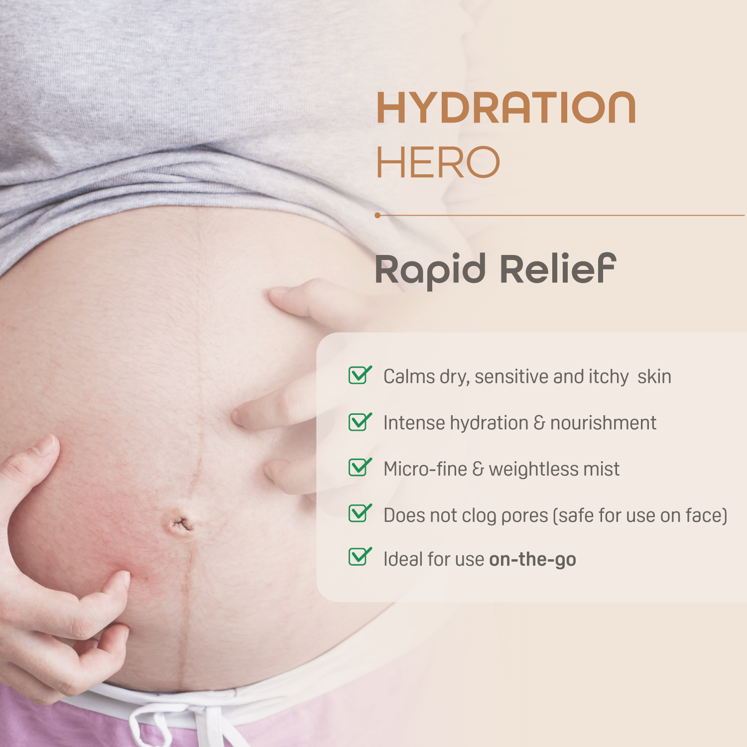 Convenient spray application to deliver immediate hydration and on-the-go relief.