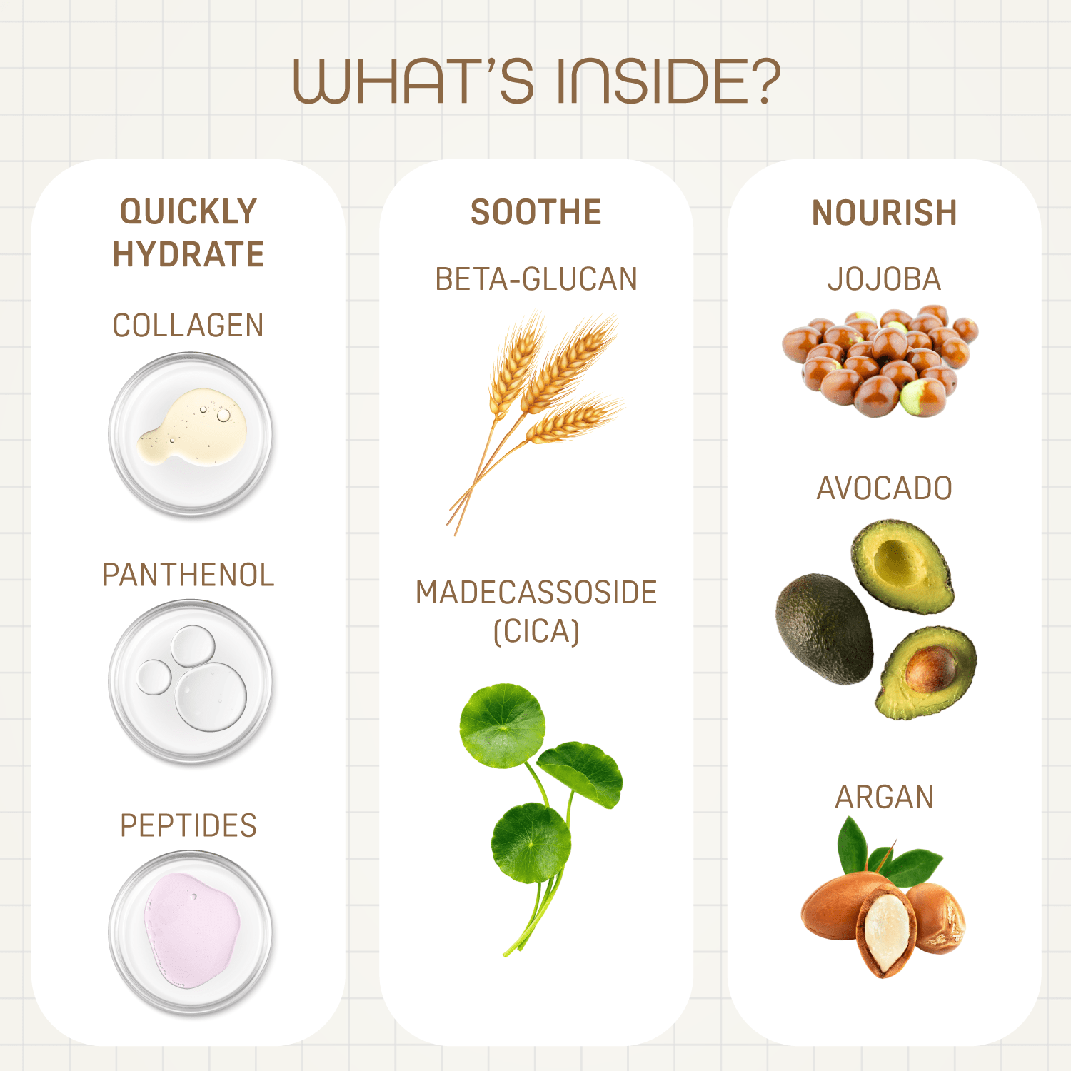 Collagen, Peptides, and Panthenol enhance elasticity and strengthen the skin barrier. -